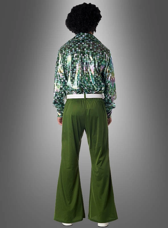 Das Discokostüm für Männer besteht aus einer weiten, grünen Schlaghose mit bequemem, dehnbarem Bund und Gürtelschlaufen. Der Stoff der Hose ist dehnbar und matt-grün gehalten.