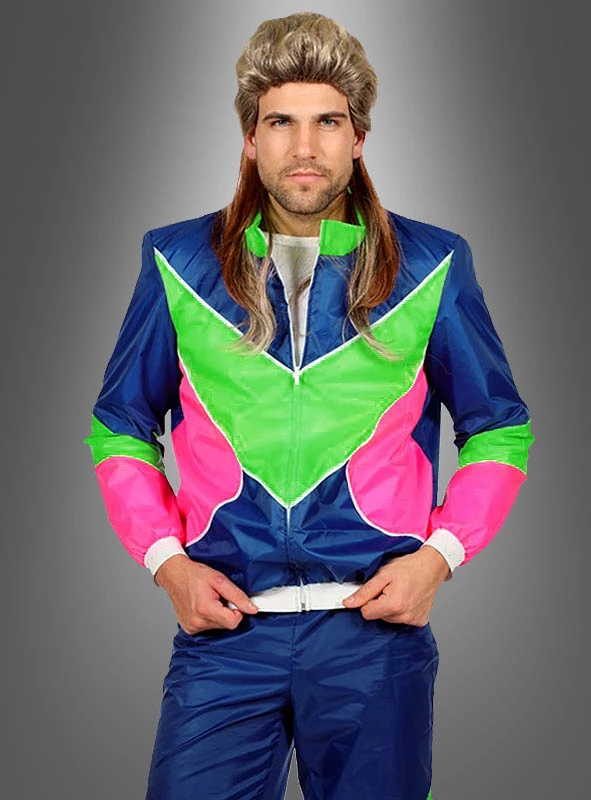 Dieser farbenfrohe Retro Jogginganzug war die typische 80er Kleidung vieler Herren. Dieser Look wurde auch gerne als Assi Kostüm bezeichnet. Bequem war die 80er Mode für Männer auf jeden Fall. Sogar Dieter Bohlen trug bei Auftritten von Modern Talking gerne mal einen Jogginganzug.