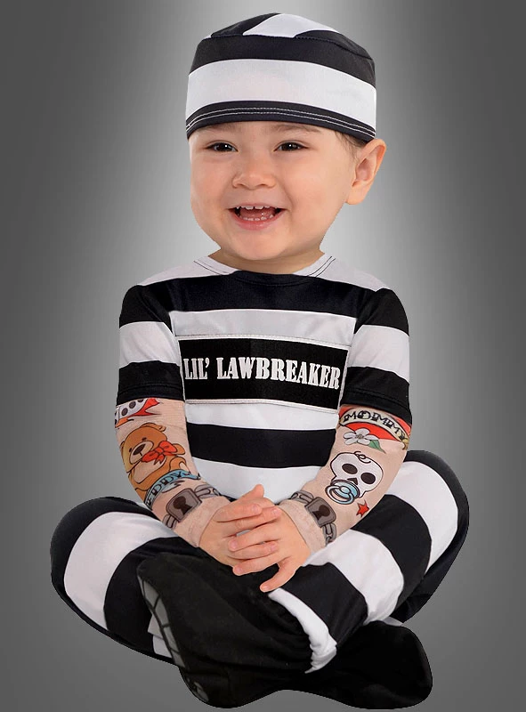 Die originelle Verkleidung für kleine Schlingel ist ausgesprochen gut durchdacht und komplett. Mehr Kostüm braucht es kaum. Der schwarz-weiß gestreifte Overall ist dehnbar, damit auch mit Windeln nichts drückt und kneift. Angenehmer Tragekomfort ist somit garantiert. Auf der Brust prangt die Aufschrift: LIL‘ LAWBREAKER, die auf einen Aufnäher aus weichem Kunstleder aufgebracht ist. Übersetzt heißt die Aufschrift „Kleiner Gesetzesbrecher“.