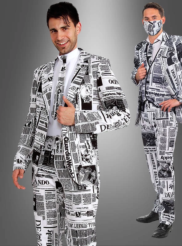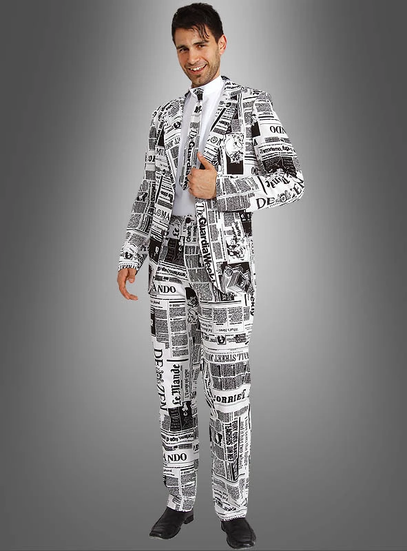 Bedruckte Anzüge mit witzigem Design sind der Renner. Mit diesem Zeitungsanzug sind Sie immer auf dem neuesten Stand, denn Sie tragen die aktuellen Schlagzeilen am Körper. Frisch aus der Druckerpresse zur nächsten Party sozusagen. Wer auffallen möchte, für den ist dieses Kostüm ideal.