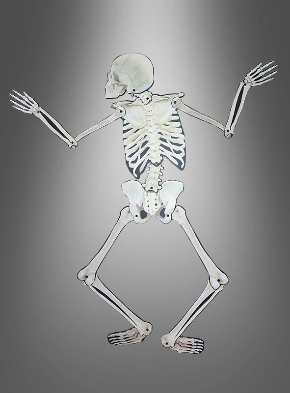 Die Skelett Halloween Wanddekoration ist nur 0,4 cm flach und kann so schnell und einfach aufgehängt werden. Die Arme und Beine sind wie bei einem Hampelmann beweglich und können so in viele lustige Positionen gebracht werden. Der von hinten abgebildete Knochenmann sieht aus, als ob er die Wand hochklettern möchte. Die Halloweendekoration ist ca. 150 x 0,4 x 158 cm und damit fast lebensgroß.