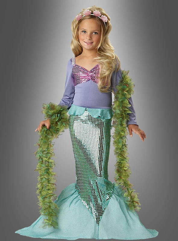 Das Kostüm für die kleine Meerjungfrau ist ein wunderschönes Kleid mit einem smaragdgrünen Rock. Das fliederfarbene Oberteil hat schöne Ärmel und eine mit lila Pailletten besetzte Brustpartie. Die kleine Nixe ist halb Mensch und halb Fisch. Das Kleid ist daher sehr schmal geschnitten und eng am Körper anliegend. Es ist aber leicht dehnbar, sodass noch genügend Bewegungsfreiheit bleibt.