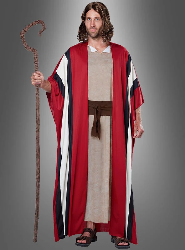 Das Männerkostüm ist auch perfekt geeignet für ein Krippenspiel zu Weihnachten. Als Josef, guter Hirte oder als Moses sieht die Gewandung sehr gut aus. Das Karnevalskostüm besteht aus einem langen beigen Gewand mit dunkelbraunem Stoffgürtel. Darüber trägt der Schafhirte eine lange Robe, die vorne offen ist. Die Robe ist rot, hat vorne zwei breite weiße Streifen, die von dunkelblauen Streifen begrenzt sind.