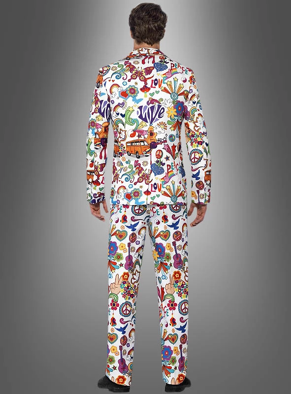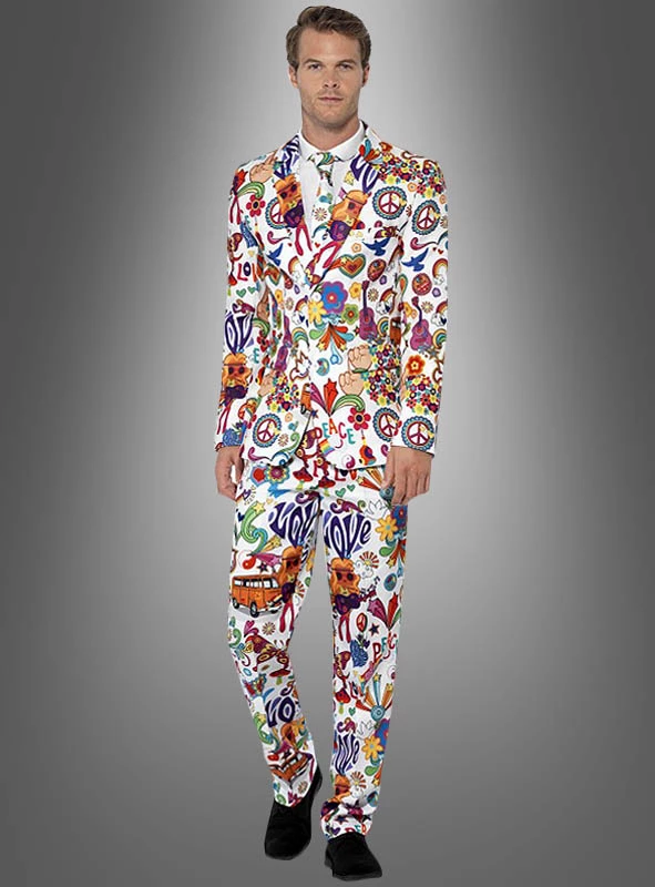 Der bunte Herrenanzug hat einen geraden, figurbetonten Schnitt und ist mit vielen verschiedenen Hippie Motiven bedruckt wie Peace-Zeichen, Blumen, Herzen, Bussen und Tauben.