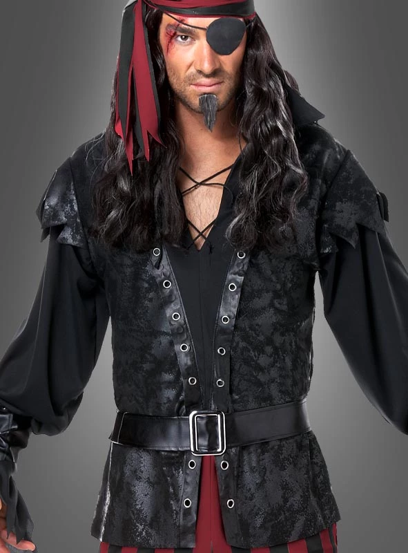 Das Piratenkostüm besteht aus einer schwarzen Weste mit angenähten Ärmeln. Dieses Oberteil ist aus schwarzem Antiklook Velours und glattem Stoff gefertigt und mit Kunstleder besetzt. Silberne Ösen und die silberne Schnalle am ebenfalls enthaltenen Gürtel verzieren das Kostüm. Die Hose hat dunkelrote und schwarze breite Streifen und einen bequemen Gummizug im Bund. Sie ist 3/4 lang und wird in die tollen Stiefelüberzieher gesteckt. Diese sind aus schwarzem Kunstleder mit breitem Umschlag oben. Die Armstulpen für die Handgelenke und das Stirnband sind ebenfalls dabei.