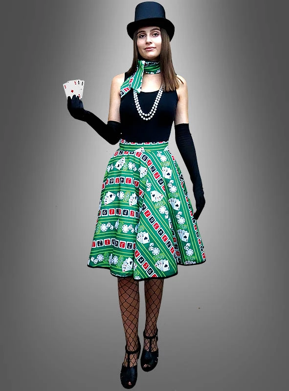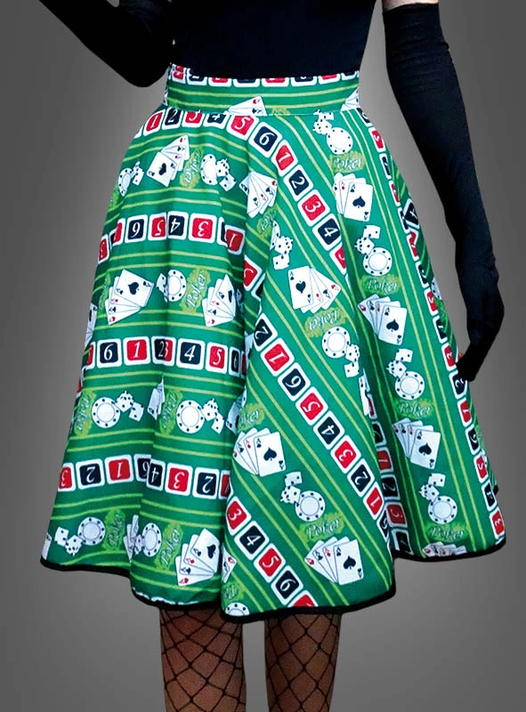 Das Set beinhaltet einen grünen Tellerrock mit Casino Pokerkarten und Glückswürfel Aufdruck. Der Rock ist in der Taille verstellbar durch eine Knopfleiste auf der Rückseite. Das passende Halstuch im gleichen Glücksspielerin Design ist mit dabei. Es kann um den Hals oder als stylisches Haarband umgebunden werden.