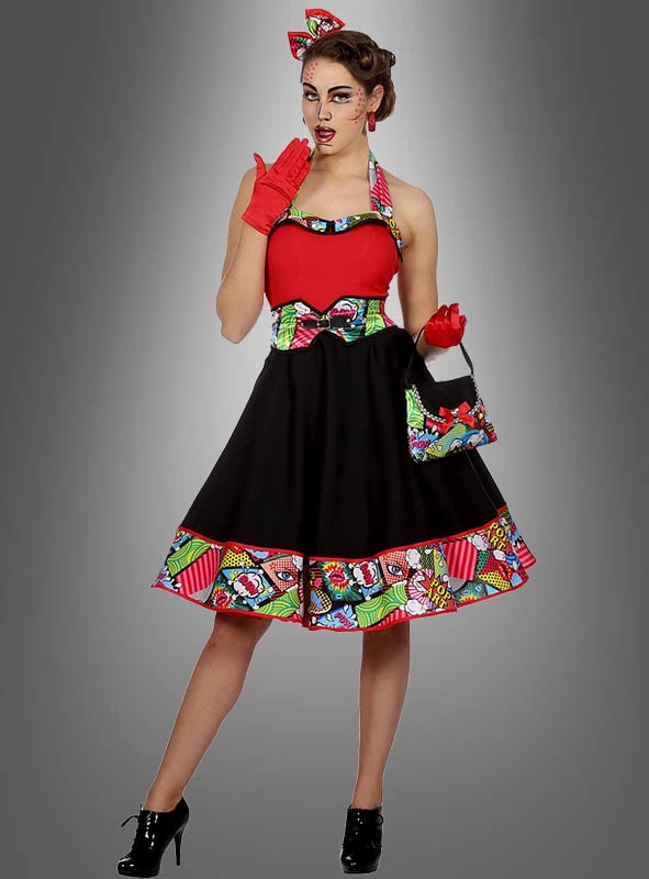 Dieses Pop Art Kleid ist ganz im Design der 50er und 60er Jahre gestaltet. Ein tolles Comic Kostüm für Damen, die den Stil von Andy Warhol und Roy Lichtenstein lieben.
