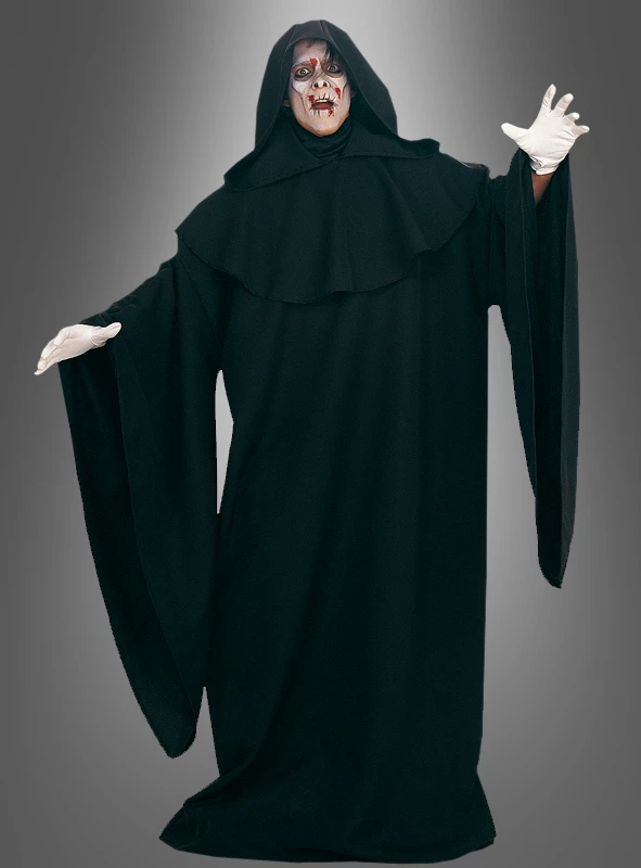 Deluxe schwarze Robe Kutte mit langen weiten Ärmel, das perfekte Kostüm für Halloween. Passend dazu die Gugel, der geschlossene Schulterumhang mit der Kapuze. Dieses Kostüm ist die Lösung für alle Henker, Vampire, schwarze Äbte, Hexenmeister und Gruftbewohner, die sich nur gerne mal schnell etwas überziehen.