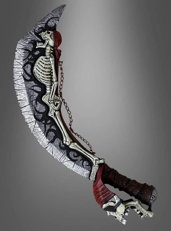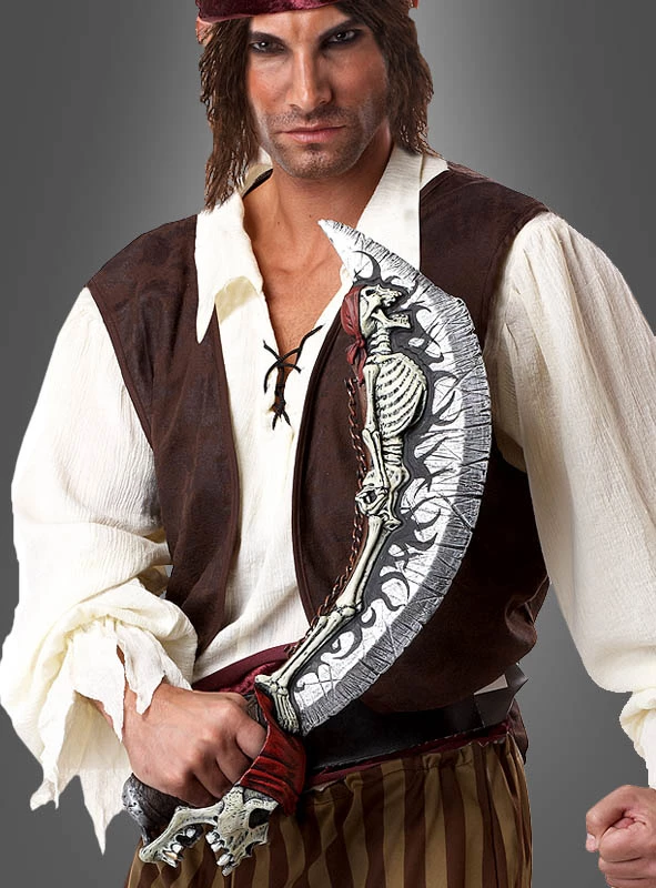 Hey Ho! Seeräuber entern die Party. Passend zum Piratenkostüm kommt hier die Waffe für alle Freibeuter. Extravaganter deluxe Piratensäbel in einzigartigem Design aus Kunststoff. Ein Totenschädel ziert den Griff und ein Skelett die schartige Klinge des Säbels. Ein weiteres Dekoelement ist die Kette, die an der Waffe angebracht ist.