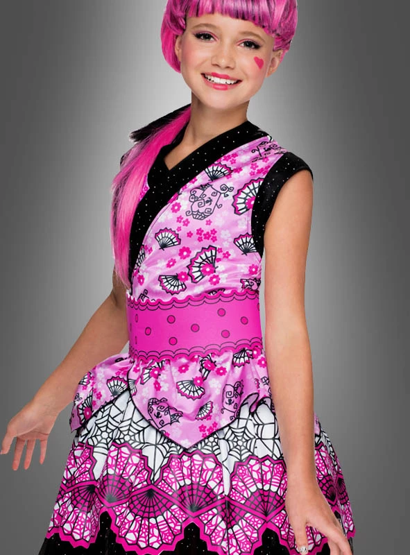 Das pinkfarbene und schwarze Draculaura Kostüm erinnert an einen japanischen Kimono mit einem Muster aus Kirschblüten, Spinnenweben und Fächer. Die Säume am oberen Kleidungsstück sind in glitzerndem Schwarz eingefasst. Der untere Teil mit dem Rock ist mehrlagig gestaltet. Ein schwarzer glitzernder Petticoat aus Tüll ist eingenäht.