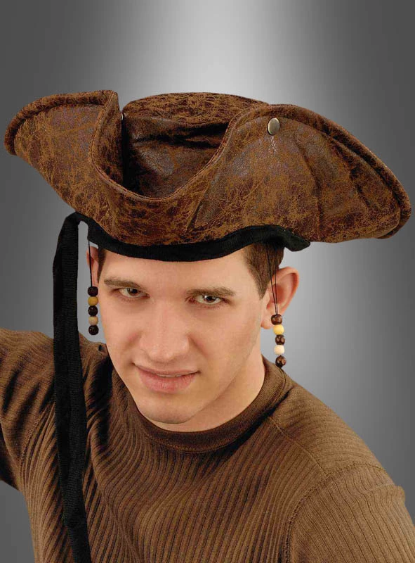 Der Hut ist aus braunem Kunstleder im Antiklook gearbeitet. Mit bronzefarbenen Knöpfen kann man ihn zum typischen Dreispitz hochknöpfen. Gesäumt wird er von einem schwarzen Band aus Stoff, das seitlich geknotet wird. Zwei Schnüre mit Holzperlen sind seitlich am Hut befestigt. Der Rand der Hutkrempe ist mit Draht verstärkt. Dieser Hut ist einem echten Piraten Kapitän würdig.