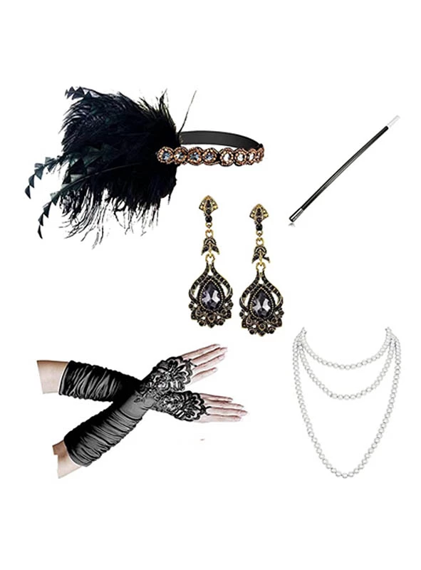 Dieses 20er Jahre Accessoire Set sieht besonders edel und luxuriös aus. Der Haarschmuck mit den schwarzen Federn besticht durch das goldene Perlenmuster am Band. Die goldenen Ohrringe mit Stecker im Antik-Look glänzen mit Schmucksteinen. Zigarettenspitze und die langen Armstulpen mit Spitze am vorderen Saum und Fingerschlaufe sehen toll zu jeder 20er Jahre Mode aus. Natürlich darf auch die schöne, lange Perlenkette nicht fehlen. Inhalt des Sets auf einen Blick: