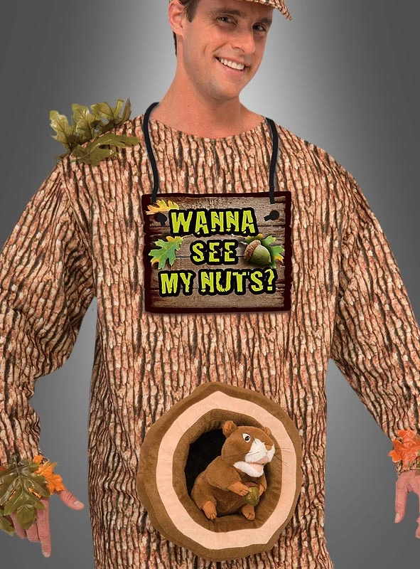 Wanna see my Nuts? Willst du meine Nüsse sehen? Steht auf dem Schild, das diese alte Eiche um den Hals hängen hat. Unter allen ausgefallenen Kostümideen ist das wohl eines der lustigsten. Im Astloch wohnt ein Eichhörnchen, das unbedingt mit seinen Nüssen angeben will.