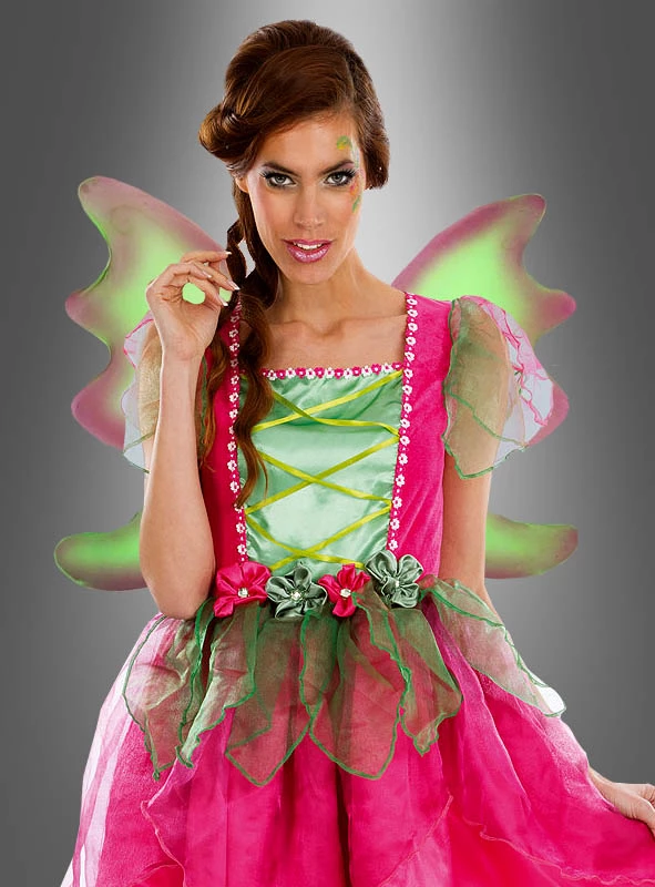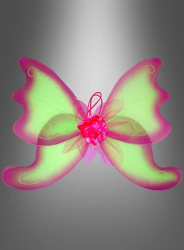 Selbstverständlich dürfen bei einem so schönen Kleid die Flügel nicht fehlen. Sie sind ebenfalls zweifarbig wie das ganze Kostüm und mit grünen Glitzerstreifen verziert. Die Mitte ziert eine pinkfarbene Stoffblüte, die mit Tüll unterlegt ist. Um die Flügel anzuziehen, schnallen Sie sie wie einen Rucksack um.