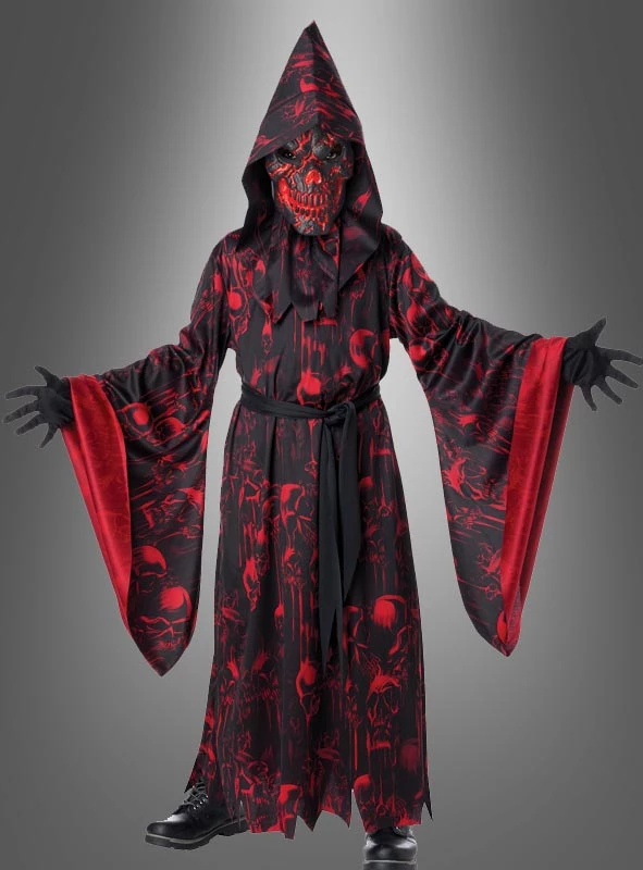 Allein beim Anblick erschaudert man. Die schwarz rote Robe des Dämons ist mit gruseligen Totenköpfen bedruckt. Das Halloween Kinderkostüm ist bodenlang und hat auffallend weite Ärmel. Der Kopf des Dämons wird mit einer spitzen Kapuze bedeckt und zu sehen ist nur die schrecklich schaurige schwarz-rot leuchtende Maske. Der Stoffgürtel wird um die Taille getragen. Hier kann man die Länge der Robe etwas korrigieren, indem man sie weiter hochbindet.