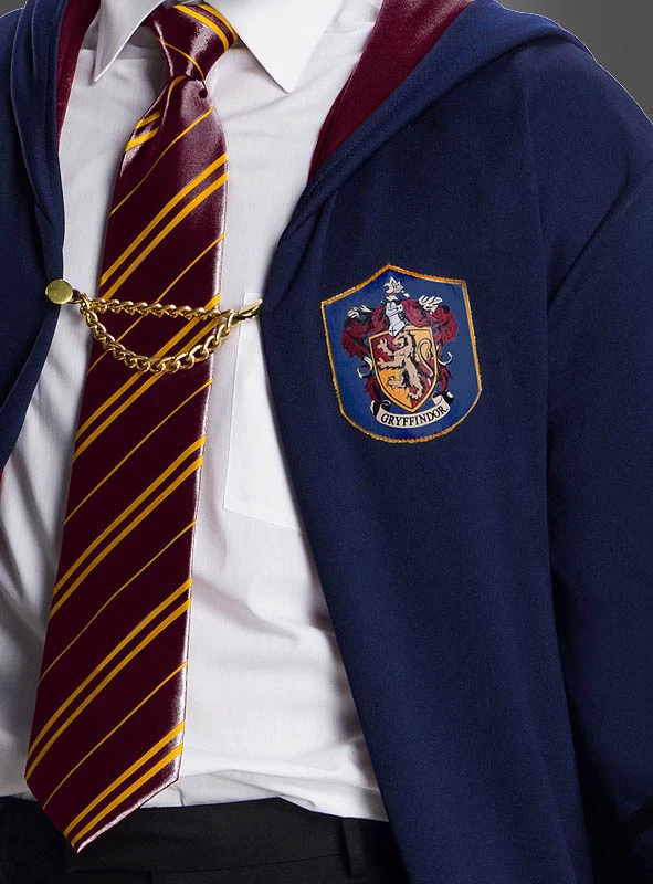 Das Harry Potter Kostüm für Damen und Herren besteht aus einer blauen Kapuzenrobe. Im Brustbereich ist das Wappen des Hauses Gryffindor aufgenäht. Mit der Kette können Sie die Robe vorne verschließen, damit das weite Kleidungsstück für Erwachsene gut sitzt. In den Ärmeln ist rotes Innenfutter aus Satin eingenäht, das sich an einem schmalen Streifen am Rand der Robe fortsetzt. Auch die Kapuze ist mit dem Satinstoff gefüttert. An den Ärmeln sind drei schwarze Satin Zierstreifen aufgenäht.