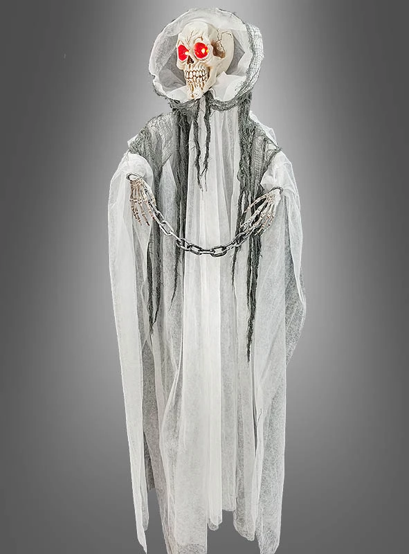 Die Augen pulsieren unheimlich, was diesen Halloween Geist zu einer effektvollen Dekoration macht. Die Arme können Sie leicht in Form biegen. Aber Achtung! Die magischen Ketten sollten intakt bleiben. Wer weiß schon, was sonst so ein weißes Skelett Gespenst alles anstellt.