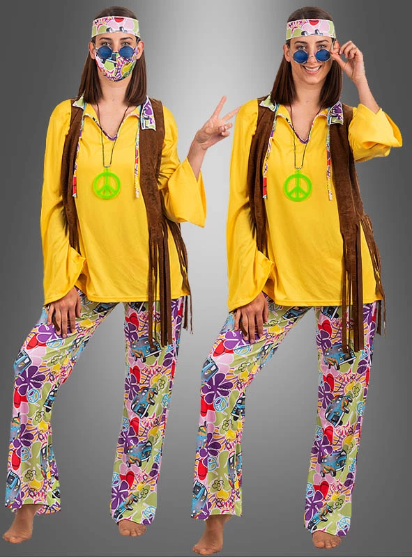 Das Damenkostüm besteht aus einer sonnenblumengelben Tunika mit schmaler bunter Einfassung am Ausschnitt. Die Tunika hat weite, ausgestellte Ärmel und ist figurbetont geschnitten. Die braune Weste mit den langen Fransen lässt das Kostüm im Hippie Look der 60er und 70er Jahre erscheinen. Auch die schöne blumige Schlaghose, die bequem sitzt und viel Bewegungsfreiheit beim Tanzen bietet ist für Blumenkinder der Hit! Passend dazu ist ein schönes Haarband dabei, das um die Stirn gebunden wird. Diese Hippie Look Damenkostüm verbreitet mit den schönen warmen Farben Licht und Liebe. Ganz im Sinne der Hippie Philosophie: Make Love not War!
