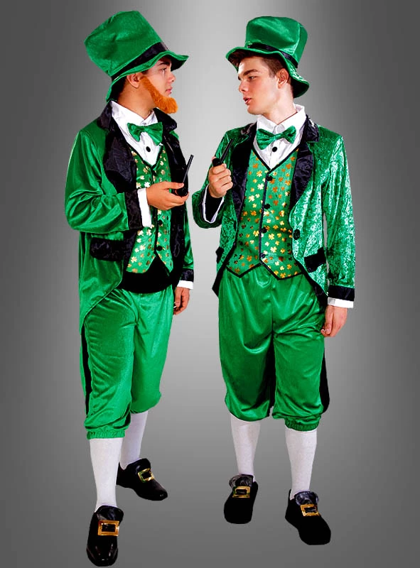 Unser Irischer Leprechaun besteht aus einem grünen Frack mit angenähtem Hemdeinsatz, Weste und grüner Fliege. Der Frack hat schwarze Satin-Kragen und zwei große Zierknöpfe in schwarz. Die Weste ist mit wunderschönen goldenen Kleeblättern bedruckt. Hut, Fliege, Weste und Hose sind aus dem gleichen grünen Pannesamt-Stoff hochwertig gefertigt. So fühlen Sie sich als Kobold in diesem Kostüm pudelwohl, wenn Ihre Lieblingsfarbe Grün ist.