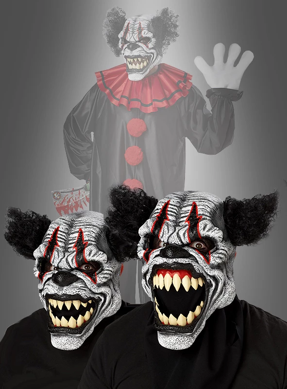 Das Killer Clown Herrenkostüm besteht aus einer beweglichen Clown Maske (der Mund kann geöffnet werden), einem schwarzen weiten Overall mit roten Bommeln, einem separaten roten Kragen und großen, weißen, gepolsterten Handschuhen mit vier Fingern. Dieser Clown lacht sicherlich zuletzt und am besten.