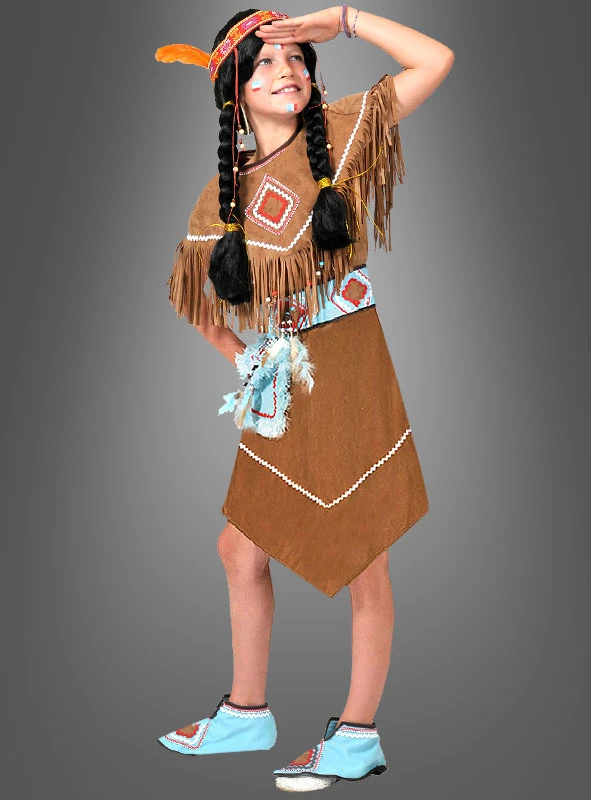 Sehr schönes Kleid im Wildleder-Look verziert mit Fransen, Borten, Perlen und Federn. Im Rücken hat das Kleid einen langen Reisverschluss. Der wunderschön verzierte Gürtel mit Gürteltasche und die Schuhüberzieher vervollständigen das Kostüm.