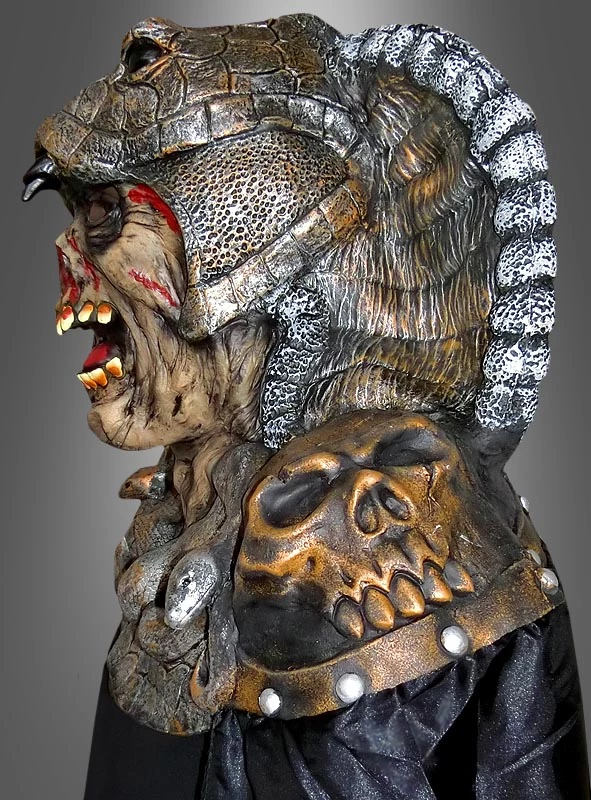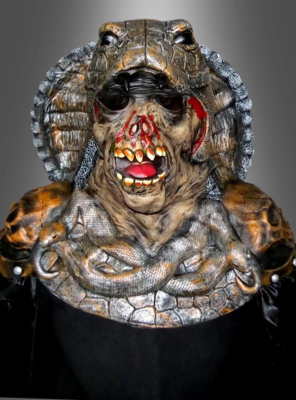 Weiche Latexmaske mit angenähtem Satin Umhang für Erwachsene in deluxe Ausführung mit toll gestaltetem Schulterteil. Totenschädel als Schulterpanzerung. Kobra Kopf mit schön gearbeitetem Schlangenmuster. Auf der Brust bilden zwei Schlangen ein stilvolles Ornament. Detailliert ausgearbeitete Vollmaske bis über die Schultern! Der angenähte schwarze Umhang ist vorne weit offen und ab der Schulter ca. 170 cm lang. Also etwa bodenlang.