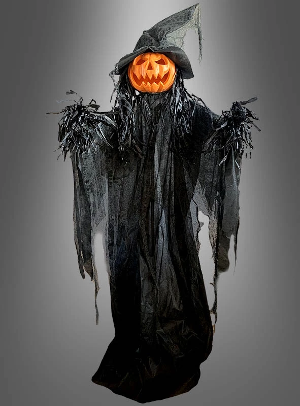 Der Kürbiskönig wird mit einem Ständer geliefert, der einfach und schnell zusammengebaut werden kann. So kann diese Kürbis Monster Standfigur frei im Raum, im Treppenhaus oder an der Bar stehen und an der Halloween Party teilnehmen. Die Figur ist ca. 180 cm groß und wird nicht so schnell übersehen. Mit seinem orangenen Kürbiskopf, dem schwarzen Gewand und dem biegsamen Hexenhut sieht das Monster richtig gut aus. Geisterhafte Geräusche und LED- Licht verstärken den gruseligen Effekt. Unheimlich!