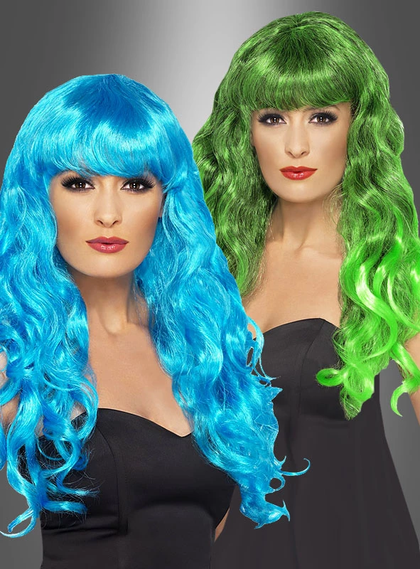 Die Langhaarperücke mit Pony ist leicht und sehr angenehm zu tragen. Die grüne Perücke leuchtet in schönem Neongrün und ist von dünnen schwarzen Strähnchen durchzogen. Auch die blaue, einfarbige Perücke hat einen intensiven Farbton. Beide Damenperücken haben einen wundervollen Glanz.