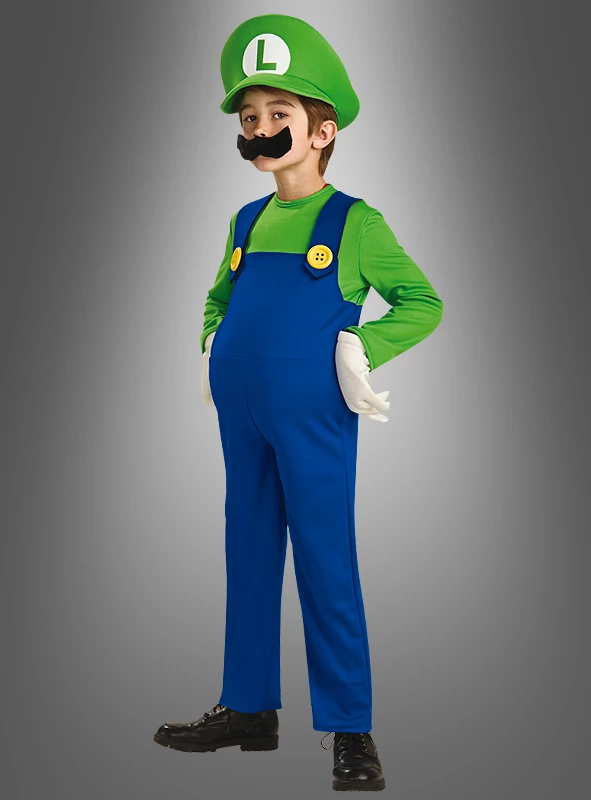 Super Luigi Kostüm deluxe für Kinder mit aufblasbarem Bauch, Mütze und weißen Handschuhen. Der Overall besteht aus der typischen blauen Arbeitshose mit großen gelben Knöpfen, eingenähtem grünen Oberteil mit Klettverschluss im Rücken. Der Bart ist ebenfalls im Lieferumfang enthalten. Mit diesem Komplett-Kostüm kann Super Mario mit Luigi um die Häuser ziehen. Ein prima Partnerkostüm für Nintendo-Fans. Original Nintendo Lizenz!