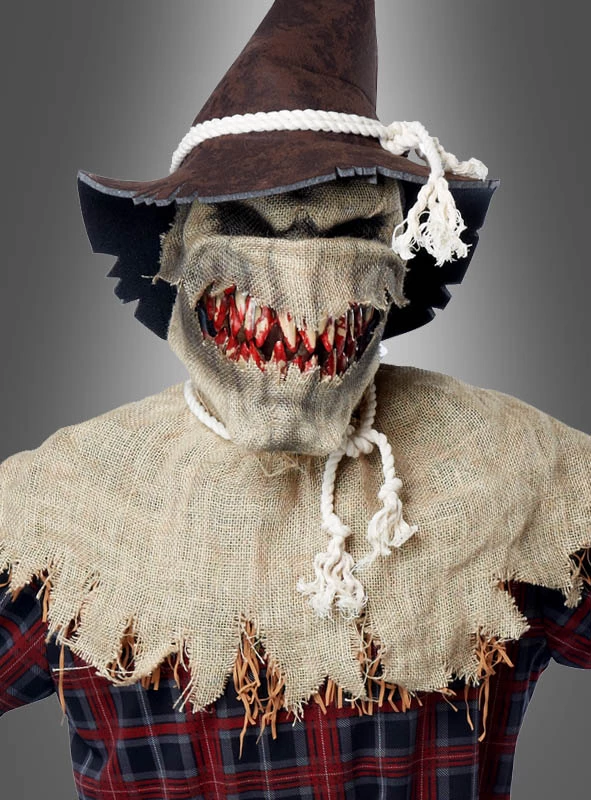 Gruseliger geht es kaum! Im Vogelscheuche Halloween Kostüm werden Sie der absolute Schocker sein. Vor allem, weil sich das Gesicht der gruseligen Strohpuppe bewegt. Wenn Sie den Mund weit öffnen, dann macht das der Mund der Vogelscheuche ebenfalls und entblößt messerscharfe Zähne. Der Effekt ist Horror pur.