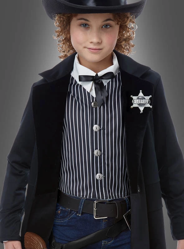 Zum Sheriff Kostüm für Kinder gehören ein Mantel mit angenähter gestreifter Weste und ein Cowboyhut. Der lange Mantel ist aus schwarzem Stoff, mit Schulterpolstern ausgestattet und am Kragen mit Samtstoff verziert. Taschen sind zwar nicht vorhanden, aber die breiten Taschenblenden verschönern den Mantel zusätzlich. Der Mantel kann mit einem einzelnen Zierknopf vorne geschlossen werden. Im hinteren unteren Bereich ist der Mantel hoch geschlitzt. Das gibt viel Bewegungsfreiheit beim Spielen. Die gestreifte schwarz-weiße Weste ist eingenäht und kann mit dekorativen silbernen Metallknöpfen geschlossen werden.