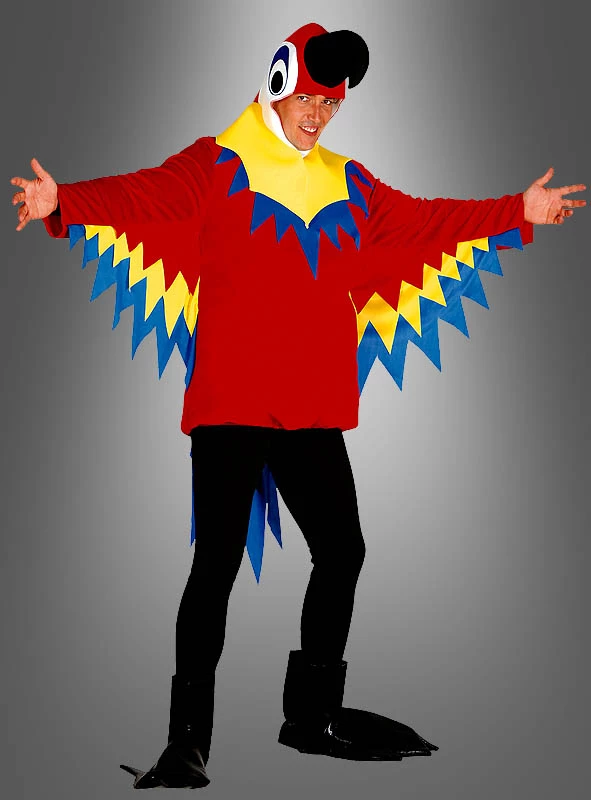 Im Papageienkostüm fühlen Sie sich wohl. Das Kostüm ist ganz in Rot, Blau und Gelb gehalten. Nur das Gesicht ist weiß, Füße, Schnabel und Augen schwarz. Das Oberteil besteht aus einer roten Tunika aus Samtstoff, die am Vorder- und Rückenteil mit weichem Schaumstoff unterpolstert ist. Am unteren Saum ist ein Gummizug eingenäht. An den Ärmeln sind die Flügel aus fließendfallendem Stoff angenäht. Wenn Sie die Arme heben, sieht man die bunten Schwingen. Auch die lange Schwanzfeder aus drei Lagen Stoff ist hinten angenäht. Am vorderen Halsausschnitt befindet sich ein blauer zackig geschnittener Latz. Darüber wird der Papageienkopf wie eine Kapuze mit kurzem gelben Kragen getragen. Der schwarze Schnabel ist gepolstert für guten Stand. Mit im Lieferumfang sind auch die schwarzen Schuhüberzieher aus Kunstleder.