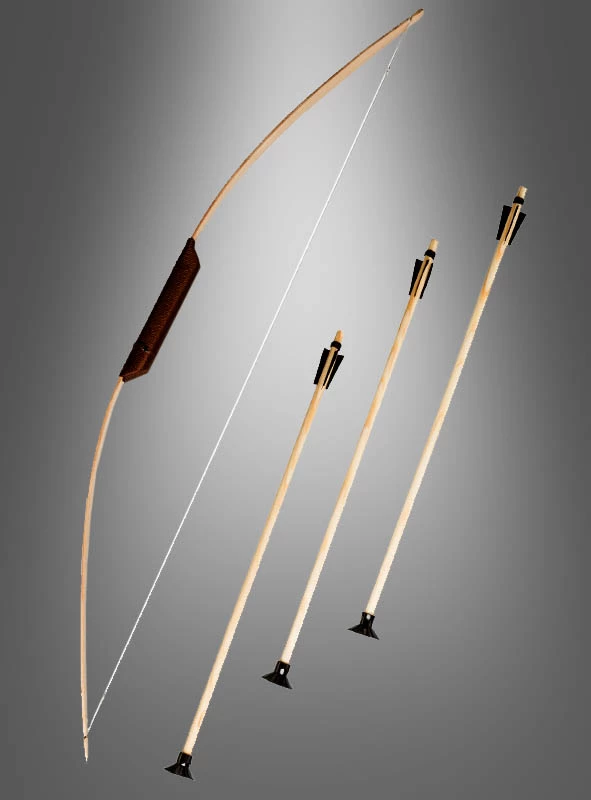 Das 4-teilige Waffenset passt zu Mittelalter Kostümen, zu Robin Hood oder auch zu Indianer Verkleidungen für Wild West Partys. Der Bogen aus Holz ist 80 cm lang und kann als Kostüm Accessoire für Kinder und Erwachsene getragen werden. Mit im Lieferumfang sind die drei Pfeile aus Holz, die an der Spitze mit Saugnäpfen versehen sind.