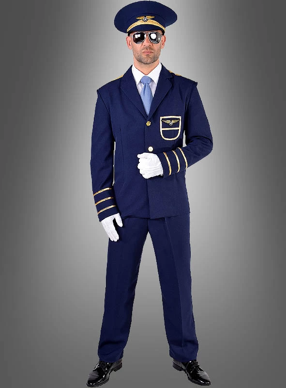 Das Pilotenkostüm besteht aus zwei Teilen. Die dunkelblaue Jacke hat goldfarbene Zierstreifen aus Borte an den Ärmeln und an den Schultern. Damit Ihre Erscheinung imposanter und autoritärer wirkt – schließlich haben Sie das Kommando im Flugzeug – sind in die Jacke Schulterpolster eingenäht. Auf Höhe der linken Brust befindet sich eine kleine Tasche, die mit Goldborte und einem Offiziersabzeichen verziert ist. Die Jacke kann zugeknöpft werden, so dass Sie sie bei Bedarf auch leger offen tragen können.