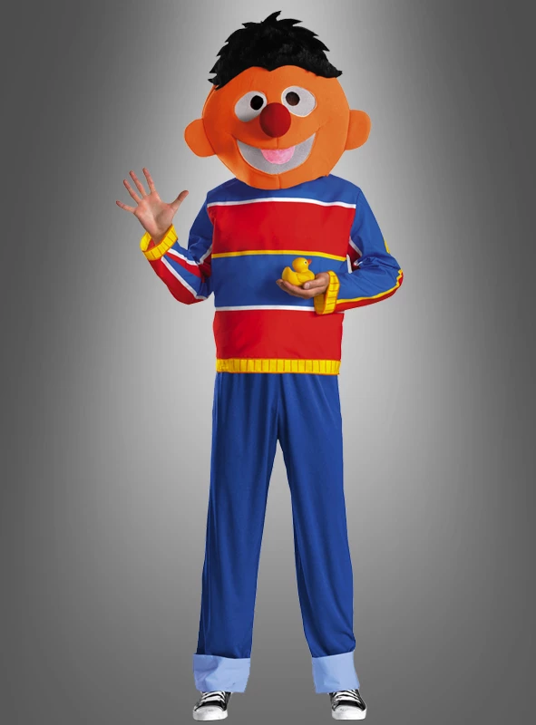 Ernie und Bert sind direkt aus der Sesamstraße zu uns gekommen! Ein sehr schönes Retro Ernie Kostüm mit tollem 3-D Plüsch Kopfteil. Die Maske besteht aus Fleecestoff mit Plüschhaaren. Leicht und angenehm zu tragen. Augen und Mund sind mit dünnem Netzstoff geschlossen, durch den man gute Sicht hat. Shirt und Hose machen das Kostüm perfekt. Fehlt nur noch das Quietscheentschen (nicht im Lieferumfang enthalten).