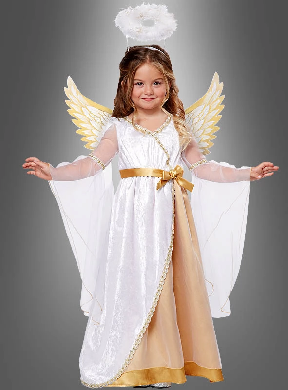 Wir haben die schönsten Engel Kostüme für Kinder im Sortiment. Dieser kleine Engel wird mit seinen goldenen Flügeln und dem weißen Heiligenschein alle anderen Engel in den Schatten stellen. Wunderschönes Kleid für Krippenspiele zu Weihnachten.