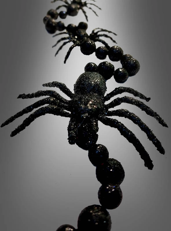 Die Spinnen Girlande ist schwarz und mit schwarzem Glitter versehen. Sie ist ca. 160 cm lang. Die 11 Spinnen daran sind unterschiedlich groß und etwa 7 – 10cm breit.