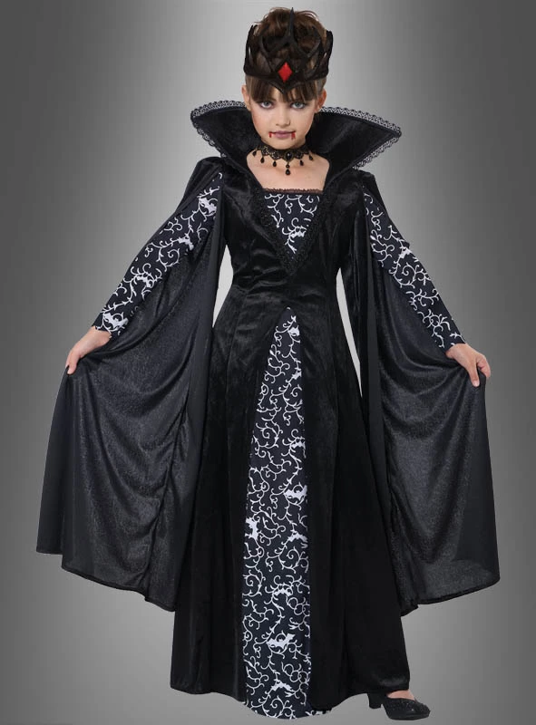 Das bodenlange Vampir Kleid für Mädchen ist leicht A-förmig geschnitten und besteht aus dehnbarem schwarzem Stoff mit weißem Rankenmuster. Im schönen Muster sind kleine Fledermäuse zu sehen. Schwarz-glitzernde Spitzenborte verziert den Brustbereich und den Rand des schönen Stehkragens. Der große Stehkragen ist für besseren Stand mit abgepolstert. Die Ärmel sind mit weiten, schwarzen Schleiern ab der Schulter bestückt. Mädchen lieben dieses Vampirkleid.