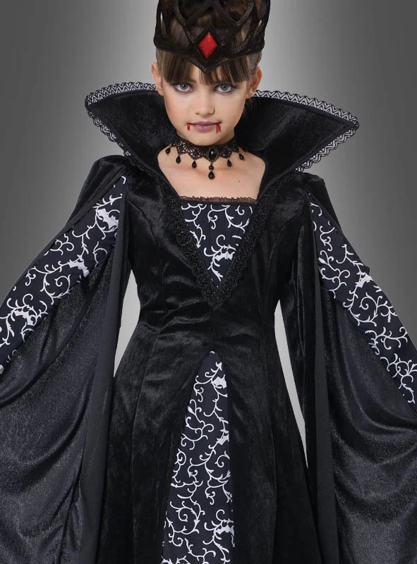 Im Vampirin Kostüm schwarz für Mädchen bekommt unsere Vampir Königin Mina Konkurrenz. Denn dieses Kleid ist ebenso königlich und einfach nur traumhaft schön. Die düstere Lina ist die neue Königin in der Gruft.