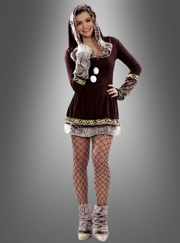 Unser Eskimo Kostüm ist ein weiches Kapuzenkleid, figurbetont mit kurzem Rockteil und langen Ärmeln. Die großzügig gehaltene Kapuze kann lässig aufgesetzt werden, und beim Abnehmen wird auf keinen Fall