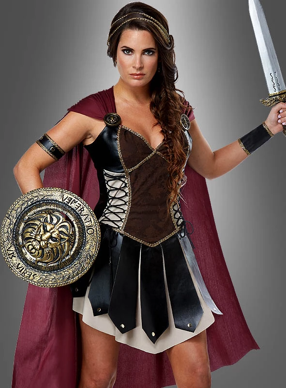 Darüber trägt unsere sexy Gladiatorin einen dunkelroten Umhang. Das Cape wird am Kleid befestigt, darüber kommen zwei dekorative Medaillons mit Löwenköpfen. Das Stirnband sorgt dafür, dass Ihre Haare während des Kampfes nicht im Weg sind. Als zusätzliche dekorative Elemente sind ein Oberarmband und ein Handgelenkband enthalten. Die schwarzen Beinstulpen im Lederlook sind ebenfalls dabei.