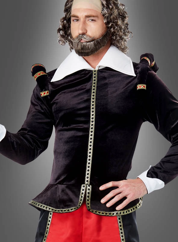 Das Shakespeare Kostüm besteht aus zwei Teilen. Das schwarze Oberteil aus dehnbarem Samtstoff ist mit goldener Borte verziert. Die weißen Ärmelaufschläge sind leicht wattiert und angenäht. Auch der weite weiße Kragen ist angenäht und für guten Stand verstärkt. Die Schultern sind besonders schön gestaltet. Die rund geformten Polster sind weich gefüllt und mit rot-goldener Borte reich verschönert. Im Rückenbereich sorgt ein Klettverschluss für einfaches An- und Ausziehen.