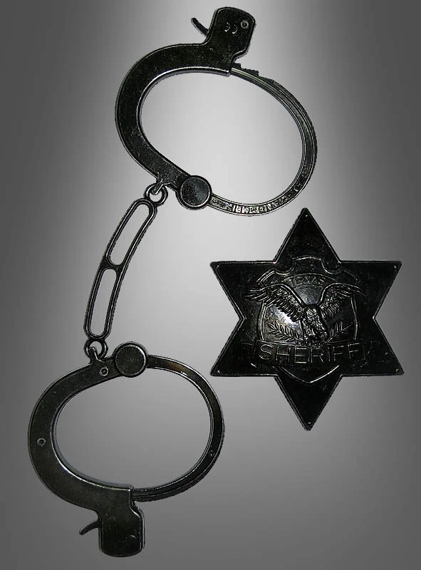 Sheriffstern und Handschellen aus Metall in edler deluxe Ausführung. Altsilber-schwarz im Antiklook gehalten. Auf dem Stern steht Texas und Sheriff geschrieben, damit jeder gleich weiß, mit wem er es zu tun hat. Der aufgeprägte Adler im Waffen auf dem Stern macht dieses Abzeichen zu etwas Edlem. Die Anstecknadel ist sehr stabil. Größenverstellbare Handschellen mit Hebel zum Öffnen.