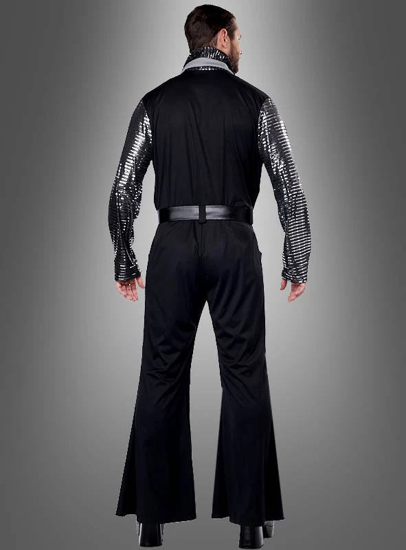 Der bequeme 70er Jahre Overall für Herren ist mit einer tollen Schlaghose ausgestattet. Ein Muss in den Siebzigern! Der Overall ist schwarz und macht eine schlanke Figur. Vorne sind große Knöpfe angebracht, die auch geöffnet werden können. Ein echter Pluspunkt. Die eingesetzten Ärmel und der angenähte große Kragen sind aus funkelndem silber-schwarzem Paillettenstoff gefertigt. Die Pailletten sind ganz besonders angeordnet. Hier wechseln sich runde und quadratische Pailletten ab und bilden ein schönes Muster. So werden Sie mit der Discokugel um die Wette glitzern. Ein toller Effekt!