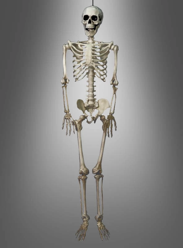Hier kommt der Knochenmann, der Reaper oder Schnitter. Ein hängendes Skelett als Halloween Deko kann vieles sein und hat viele Namen. Auf jeden Fall hängt dieses Skelett gerne auf Halloween Partys rum und beobachtet die Gäste ganz genau.