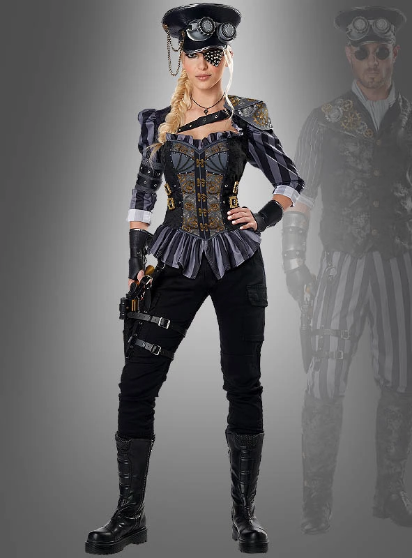 Tragen Sie einfach eine eigene schwarze Hose zum Steampunk Captain Damenkostüm. Als Partnerkostüm haben wir den Steampunk Captain für Herren ebenfalls im Sortiment.