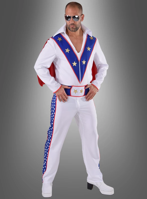 Mit diesem Stuntman Kostüm für Herren wagen Sie die gefährlichsten Sprünge. Angelehnt an das berühmte Outfit von Stuntlegende Evel Knievel passt es mit den typisch amerikanischen Sternen auch ideal zu einer USA Party.