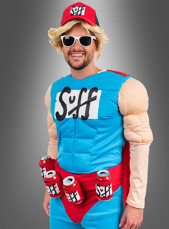 Das Biermann Kostüm für echte Partyhelden besteht aus einem 2-Teiler, was ein echter Vorteil ist. Das Oberteil mit den abgenähten und wattierten Muskeln macht Sie im Handumdrehen zum starken Superhelden. Dadurch, dass die Hose separat ist, wird der Toilettengang anders wie bei so manchem Overall zum Kinderspiel. Der Gürtel mit den Dosenhaltern ist natürlich ein wichtiges Accessoire und die Mütze mit dem Suffman Aufnäher passt perfekt zum Outfit.