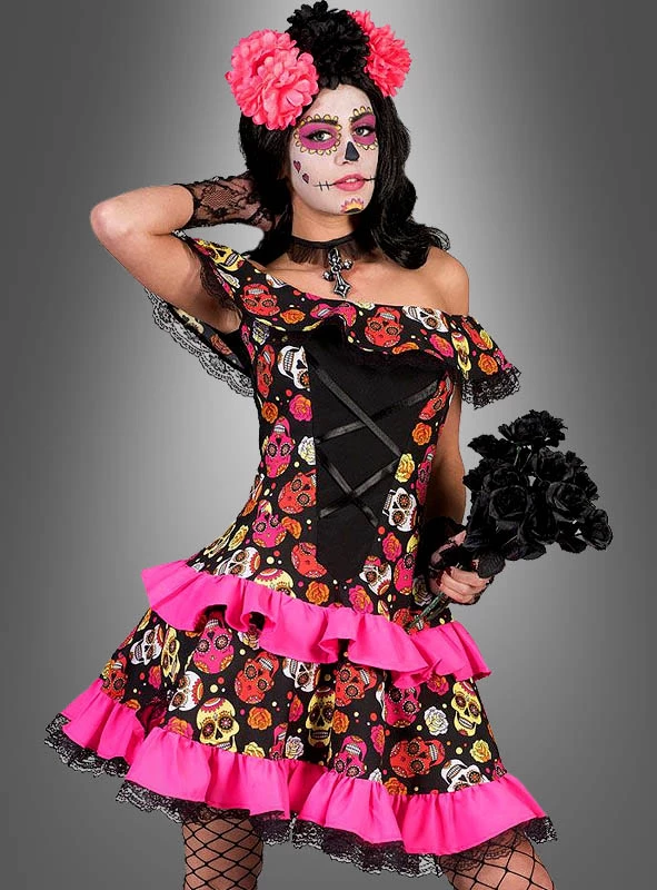 In diesem Kleid werden Sie sich wohl fühlen. Ein Reißverschluss im Rücken sorgt für einfaches An- und Ausziehen. Der schwarze Stoff ist mit bunten Totenköpfen, den Sugar Skulls und Blüten bedruckt. Der Rockteil fällt in schönen Volants und ist am Saum mit einer schwarzen Spitze bestückt. Der Rücken ist aus dehnbarem Samtstoff, was das Kleid sehr bequem und flexibel macht. Vorne ist eine schöne Zierschnürung angenäht, die dem Kleid zusätzlichen Pfiff gibt. Das Tag der Toten Damenkostüm Miranda wird schulterfrei getragen. Der sexy Carmen Ausschnitt sieht sehr verführerisch aus. Auch hier ist am Rand edle schwarze Spitzenborte angenäht.