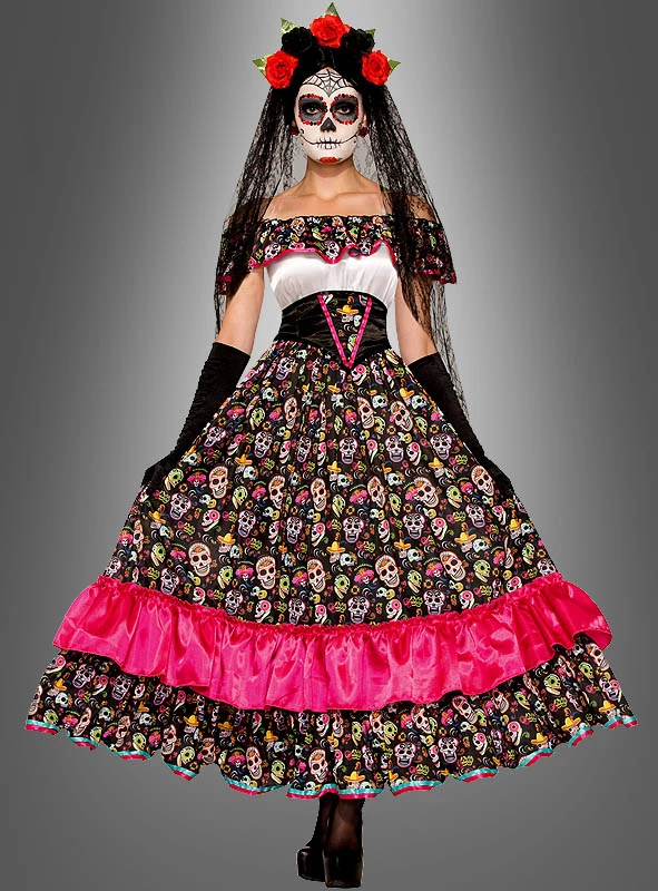 Festliches Kleid mit aufgedruckten bunten Sugar Skull Totenköpfen. Das Kleid ist lang für alle, die nicht ganz so freizügig feiern möchten. Kleine Pölsterchen am Po und an den Schenkeln werden perfekt kaschiert. Breiter, gerüschter Volant aus leicht glänzendem pink Stoff und schöne Abschlussborte verzieren dieses Halloweenkostüm zusätzlich. Schulterfrei mit breitem Volant am Ausschnitt wie bei einer Carmenbluse. Durchsichtige Spaghetti-Träger sorgen für guten Halt. Mit dem breiten elastischen Gürtel mit mexikanischen Totenkopf Motiven kann die Taille betont werden. Der Stoff ist leicht dehnbar und sehr angenehm zu tragen. Passt sich toll der Figur an.